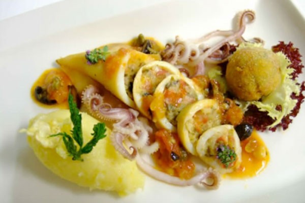 Limpe as lulas, mantendo o corpo inteiro. Pique as barbatanas e os tentáculos e refogue-os com o alho picado e um pouco de azeite de oliva. Junte o vinho branco e desligue o fogo. Acrescente as gemas, salsinha, farinha de rosca, sal e pimenta. Misture até obter uma farofa bem úmida. Recheie as lulas com a farofa, sem enchê-las muito para não estourarem. Feche-as com palitos. Unte uma assadeira com azeite, coloque ali as lulas eleve-as para assar por 40 minutos em forno médio. À parte, refogue o tomate em cubinhos em um pouco de azeite de oliva. Passe por uma peneira. Sirva as lulas em rodelas, com o molho de tomates.