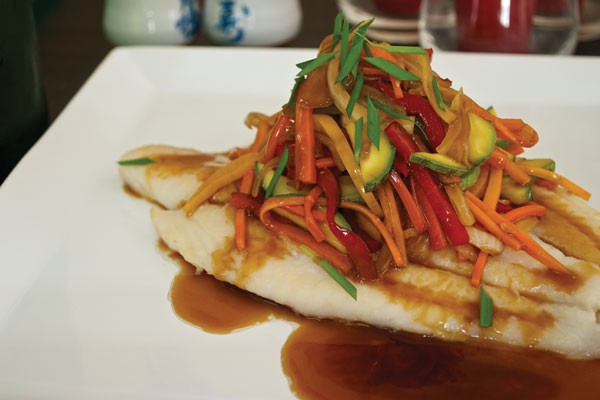 Secar os filés com papel toalha. Pincelar óleo de canola nos filés e temperar com sal. Grelhar os peixes em uma frigideira antiaderente. Retirar os filés e drenar o excesso de gordura em papel toalha. Adicionar a cebola e a cenoura, refogar, em seguida acrescentar os pimentões e a abobrinha e refogar novamente. Colocar o molho teriyaki e misturar com os vegetais. Servir os vegetais por cima do peixe e enfeitar com a cebolinha cortada.